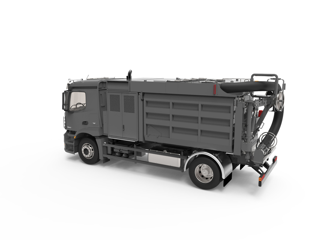 Mercedes Benz'den Atego, mükemmel taşıma kapasitesi nedeniyle tercih edilen nakliye aracı olarak seçildi. Yük durumundaki yaklaşık brüt ağırlık malzemeye bağlı olarak 12,000 kg.'dır. Tüm güç araç motoru tarafından sağlanır. Fanşa monte edilmiş hidrolik pompaları çalıştırmak için bir ara dişli kutusu kullanır. Tek yüksek performanslı fan, yerleşik kompresör ve diğer tüm hareketliler ve boşaltma fonksiyonları bu şekilde sağlanır.